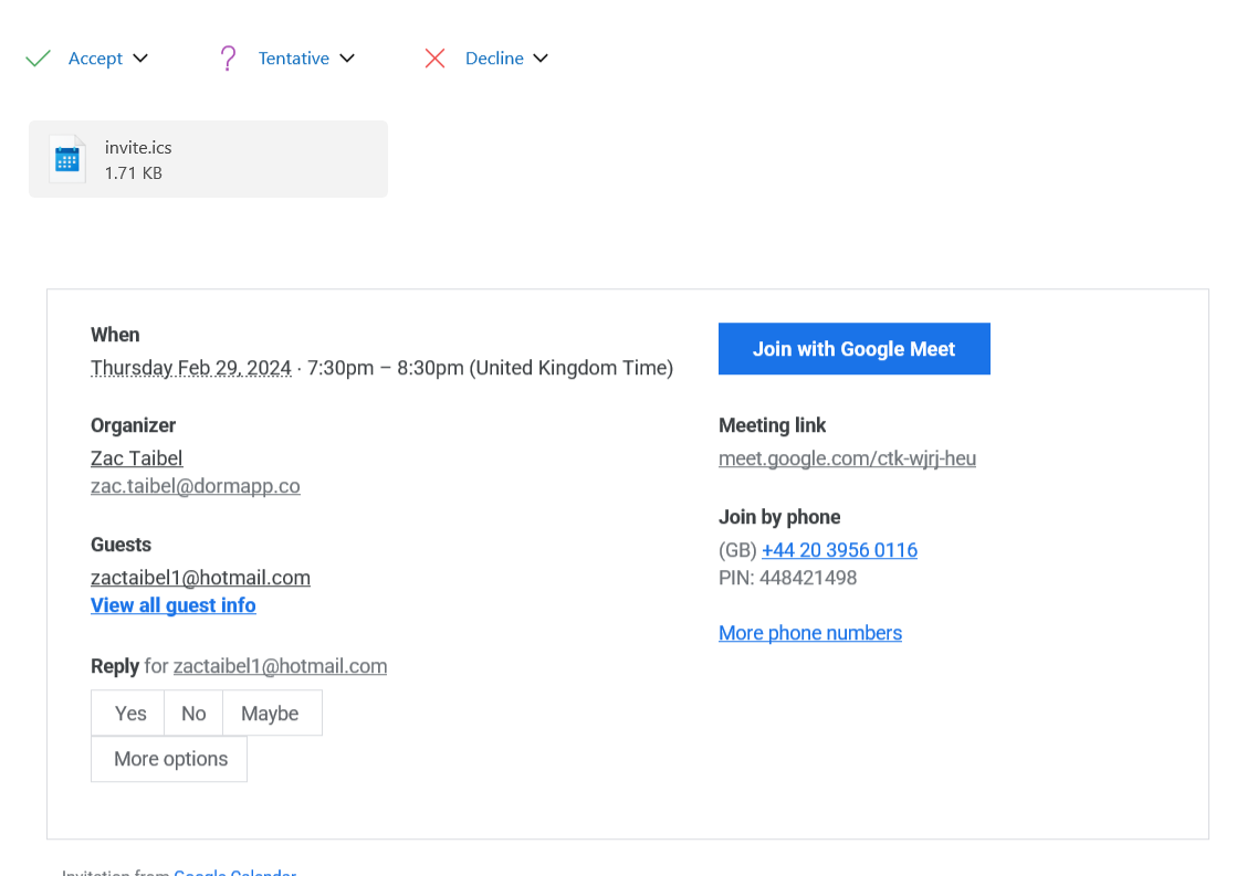 - If you have Google Calendar, the invitation will show on your Google Calendar.